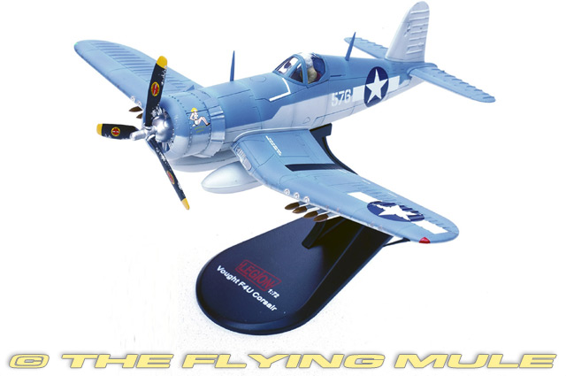 1st Lt. Edwin Olander served two tours with the VMF-214 "Black Sheep". From mid-September 1943 until December 30, 1943 he is credited with shooting down 5 Zeroes along with 3 probable. On October 17th and 18th 1943 while flying Corsair White 576 BuNo. 02576 "Marine's Dream" Olander scored two of his 5 kills and 1 of his 3 probables. The aircraft had a field modified paint scheme and the national insignia had 2 white bars and no blue surround. This aircraft was written off as the result of an accident on Bougainville. Designed to meet a US Navy requirement for a single-seat carrier based fighter, the F4U was first flown on May 29th, 1940. This versatile aircraft saw service with both the Navy and Marine Corps in WW II and in the Korean War. During its lifetime, the Corsair underwent numerous improvements such as a lengthened fuselage, a high visibility bubble-top canopy and folding inverted gull wings that provided clearance for a large propeller. Its performance advantage, 400 mph capability, the ability to withstand punishment and six .50 Browning machine guns made the F4U a devastating weapon against aircraft, ground targets and ships. © Copyright 2003-2025 The Flying Mule, Inc. The Legion Models range presents detailed, ready-made diecast models of military aicraft in 1:72 scale. Legion Models diecast airplanes feature: - Diecast metal construction with some plastic components.