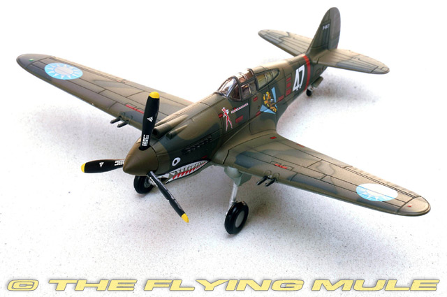 The American Volunteer Group (AVG), famously known as the Flying Tigers, was a unit of the Republic of China Air Force, recruited from U.S. aviators to fight against Japan before America entered World War II. Flying shark-mouthed P-40 Warhawks, they achieved remarkable success in 1941 - 1942, destroying far more enemy aircraft than they lost. Led by Claire Chennault, their bravery and skill boosted Chinese morale and became legendary. The unit disbanded in mid-1942, with many members joining the U.S. Army Air Forces. Robert Tharp (R.T.) Smith (February 23, 1918 - August 21, 1995) received his primary flight training at the Allan Hancock College of Aeronautics at Santa Maria, California and completed basic training Randolph Field, Texas. He was commissioned a second lieutenant in June 1940, and returned to Randolph Field where his first assignment was as a basic flight instructor. Smith resigned his commission in July 1941 in order to join Colonel Claire Lee Chennault's American Volunteer Group (AVG) as a "soldier of fortune" with the Nationalist Chinese Air Force. Promoted to flight leader in the Third Pursuit Squadron, "Hell's Angels", Smith was credited with shooting down a total of 8.9 Japanese planes, and was twice decorated by the Chinese government. Designed to meet a USAAC requirement for a pursuit aircraft, the P-40 Warhawk was first flown on October 14th, 1938. This aircraft was tough, virtually trouble-free and saw continual improvements to arms, armor and engines. The P-40 served in numerous combat areas; often outclassed by its adversaries in speed, maneuverability and rate of climb, it earned a reputation for extreme ruggedness. Its strong construction, heavy firepower, and ability to dive enabled it to compete with enemy fighters, and it was a formidable ground-attack aircraft. P-40s were also flown by the famed Flying Tigers against the Japanese in China. © Copyright 2003-2025 The Flying Mule, Inc. The Legion Models range presents detailed, ready-made diecast models of military aicraft in 1:72 scale. Legion Models diecast airplanes feature: - Diecast metal construction with some plastic components.