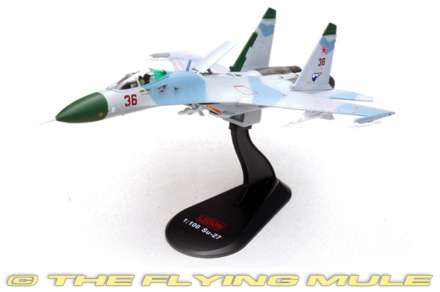 On September 13, 1987 Su-27 Flanker B (early Type) Red 36 from the 941st IAP V-PVO piloted by Senior Lieutenant Vassily Tsimbal intercepted the Norwegian P-3 Orion "602" flown by Lt. Salvesen and 9 crewmembers off the Kola Peninsula. Red 36 made three passes, each one bringing the two aircraft closer until the third encounter caused the Su-27's vertical stabilizer to hit the P-3 propeller tearing the Su-27 stabilizer tip off and sending a piece of the P-3 propeller into "602" causing decompression. Remarkably both aircraft safely returned to their bases. Designed by the Soviet Union to challenge the superiority of fourth generation US fighters such as the F-15 Eagle, the Su-27 was first flown on May 20, 1977. This one seat Mach-2 fighter had the Soviet Union's first operational fly-by-wire system. The aircraft is very large compared to the MiG-29, its closest Soviet counterpart, but it is built with a high percentage of titanium, which helps minimize its weight. It is exceptionally agile and is perhaps most famous for its "Cobra" maneuver, which is a short, sustained level flight at a 120 degree angle of attack, often performed at air shows. © Copyright 2003-2026 The Flying Mule, Inc. The Legion Models 1:100 range presents detailed, ready-made diecast models of military aicraft in 1:100 scale. Legion Models diecast airplanes feature: - Diecast metal construction with some plastic components.