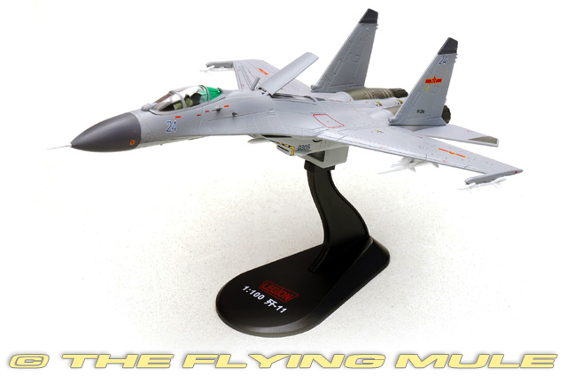 The Shenyang J-11BH is a modernized fighter operated by the People’s Liberation Army Navy Air Force. Derived from the J-11B, the J-11BH is a land based Flanker variant adapted for maritime operations. It features improved Chinese avionics, radar, electronic warfare systems, and compatibility with indigenous air to air and air to surface weapons. The aircraft is powered by Chinese WS-10 engines, replacing earlier Russian powerplants. J-11BH units conduct air defense, maritime strike, and patrol missions along China’s coastline. The type provides the PLANAF with long range interception capability and forms an important part of China’s naval aviation combat force. Designed by the Soviet Union to challenge the superiority of fourth generation US fighters such as the F-15 Eagle, the Su-27 was first flown on May 20, 1977. This one seat Mach-2 fighter had the Soviet Union's first operational fly-by-wire system. The aircraft is very large compared to the MiG-29, its closest Soviet counterpart, but it is built with a high percentage of titanium, which helps minimize its weight. It is exceptionally agile and is perhaps most famous for its "Cobra" maneuver, which is a short, sustained level flight at a 120 degree angle of attack, often performed at air shows. © Copyright 2003-2026 The Flying Mule, Inc. The Legion Models 1:100 range presents detailed, ready-made diecast models of military aicraft in 1:100 scale. Legion Models diecast airplanes feature: - Diecast metal construction with some plastic components.