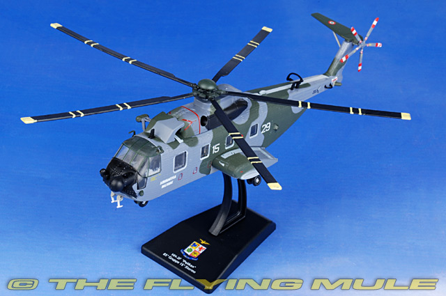 | Agusta AS-61R | | 8.75" | | 7.5" | Designed to meet a US Navy requirement for an all-weather amphibious helicopter, the Sikorsky SH-3 Sea King first flew on March 11, 1959. Originally a submarine hunter-killer, the Sea King has since been used in a variety of operations, from search and rescue, executive transport and communications to anti-ship and airborne early warning. Its five main rotor blades and tail section fold for stowage aboard aircraft carriers, and its hull can remain temporarily watertight for water landings-a risky maneuver attempted only in emergencies. When deployed by aircraft carriers, Sea Kings serve as plane guard and are the first in the air and the last to return. © Copyright 2003-2025 The Flying Mule, Inc. The Leo Models "Italian Air Force" range presents affordable, ready-made diecast models of Italian military aircraft. Leo Models "Italian Air Force" diecast airplanes feature: - Diecast metal construction with some plastic components.