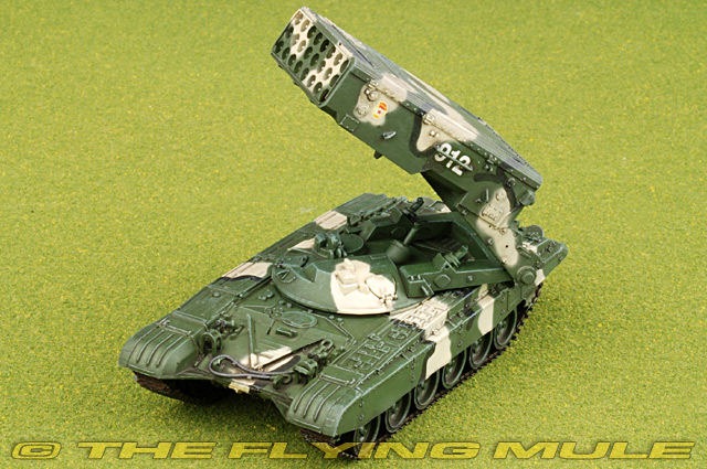 The TOS-1 is a Soviet 220mm 30-barrel or 24-barrel multiple rocket launcher and thermobaric weapon mounted on a T-72 tank chassis. The TOS-1 was designed for defeating enemy personnel in fortifications, in open country, and in lightly armoured vehicles and transport. First combat tests took place in 1988-1989 in the Panjshir Valley during the Soviet war in Afghanistan. The TOS-1 was shown for the first time in public in 1999 in Omsk. Designed to complement the T-64, the high-production Soviet T-72 was first built in 1971 and first seen in public in 1977. This medium tank is a combat vehicle with cross-country maneuverability. Powered by a V-12 diesel engine that can run on various fuels, the T-72 can be fitted with two fuel drums for additional range. Its low, rounded turret mounts a 125mm smooth bore gun capable of penetrating the M1 Abrams' armor at up to 1,000 meters. It can sustain direct hits from the M1 at a 2,000 meter range. Armed with anti-aircraft machine guns, the T-72 can also destroy low-flying targets. © Copyright 2003-2025 The Flying Mule, Inc. The ModelCollect "Armour Gold Edition" range presents detailed, ready-made diecast models of military vehicles in 1:72 scale. These models arrive pre-assembled and professionally hand-painted with a high degree of accuracy and realism. The overall quality and finish is comparable to similar models from Dragon Models and Hobby Master. ModelCollect diecast vehicles feature: - Diecast metal lower-hull with plastic components.