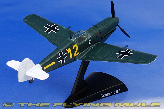 The BF109E was a German single seat fighter used during the WWII era. The 109E was the first large scale production for the 109. The 1,100 hp Daimler-Benz engines had replaced the older 650 hp Rolls-Royce engines. With a max speed of 400 mph, 38,000ft ceiling and a range of 450 miles, these fighters were a problem early for the British. BF109E was armed with 2 -13 mm machine guns and three 20 mm MG 151 cannons. Designed to meet a Luftwaffe need for a single-seat fighter/interceptor, the Messerschmitt Bf 109 was first flown on May 28th, 1935. Its all-metal construction, closed canopy and retractable gear made the Bf 109 one of the first true modern fighters of WWII. This versatile aircraft served in many roles and was the most produced aircraft of the war and the backbone of the Luftwaffe, and was flown by Germany's top three aces, who claimed a total of 928 victories between them. Armed with two cannons and two machine guns, the Bf 109's design underwent constant revisions, which allowed it to remain competitive until the end of the war. © Copyright 2003-2025 The Flying Mule, Inc. The "Postage Stamp Planes" range presents affordable, ready-made diecast models of military and civilian aircraft. "Postage Stamp Planes" diecast airplanes feature: - Diecast metal construction with some plastic components.