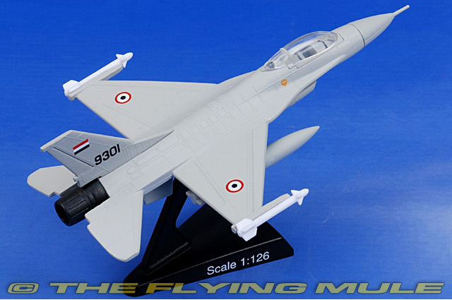 The Egyptian Air Force, or EAF is the aviation branch of the Egyptian Armed Forces. Currently the EAF has over 438 combat aircraft and 155 armed helicopters. The backbone of the Egyptian Air Force are 220 F-16 fighters. The Egyptian Air Force is the 4th largest operator of F-16's in the world, after the United States, Israel, and Turkey. Designed by General Dynamics as a lightweight, daytime USAF air-combat fighter, the F-16 was first flown on January 20th, 1974. This single-engine, supersonic aircraft has, over the years, evolved into a multirole aircraft. It has a frameless bubble canopy-giving its pilot superior visibility-and it uses advanced aerodynamics. The F-16 was one of the first designs to use a relaxed static stability/fly-by-wire system, which helps it pull 9-g maneuvers and achieve speeds of more than Mach 2. Called "Viper" by its pilots, the F-16 is considered one of the most successful aircraft designs of the Cold War, with 4,400+ aircraft built since 1976. © Copyright 2003-2026 The Flying Mule, Inc. The "Postage Stamp Planes" range presents affordable, ready-made diecast models of military and civilian aircraft. "Postage Stamp Planes" diecast airplanes feature: - Diecast metal construction with some plastic components.