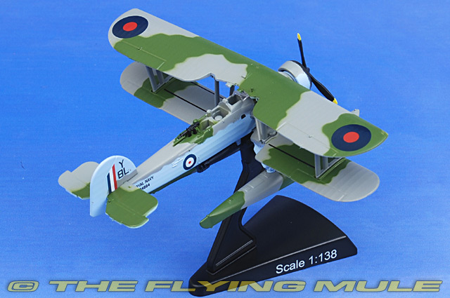 The first British Fairy Swordfish was flown on February 22, 1934. The land versions of the Swordfish were 2-3 seat carrier-based torpedo-bombers with reconnaissance capabilities. These planes were also retrofitted with floats for sea landings. A top speed of 139 mph was achieved with one Bristol Pegasus radial piston-engine. The twin-wing Swordfish had a wingspan of 45 1/2 feet and carried various machine guns, torpedoes and bombs. The last of these planes was disabled on May 21, 1945. This spotter-reconnaissance aircraft, built by the Fairey Aviation Company for the British Royal Navy, was first flown on February 22nd, 1934. Nicknamed "Stringbag" after a housewife's string shopping bag, the Swordfish could carry an unlikely combination of loads. It could lift off a carrier deck with a standard torpedo, although this made it vulnerable to fighter attack. Its low speed and stable stance made it easy to line up for a torpedo attack, as it did against the German Bismark and on the Italian naval base at Taranto, where 21 Swordfish destroyed three battleships, a cruiser, two destroyers and other warships. © Copyright 2003-2025 The Flying Mule, Inc. The "Postage Stamp Planes" range presents affordable, ready-made diecast models of military and civilian aircraft. "Postage Stamp Planes" diecast airplanes feature: - Diecast metal construction with some plastic components.
