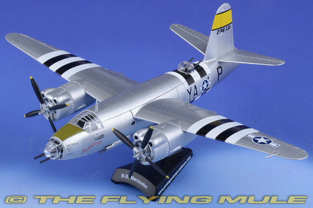 The Martin B-26 Marauder was designed to meet the USAAC need for a high speed, medium bomber. In 1939, Martin received an order for 201 B-26s. What made this order so unusual was that the company was awarded an "off the drawing board" contract; there was no requirement for a prototype or preproduction sample. This aircraft was equipped with up to 11 machine guns and 4,000lbs of bombs. Designed to meet a US Army Air Corps specification for a twin-engined medium bomber, the B-26 Marauder was first flown on November 25, 1940. Early in its service career, the B-26 was nicknamed "Widowmaker" because of its high accident statistics, especially during takeoffs and landings, when pilots were required to maintain a much higher than average speed to avoid stalling. Later model B-26Bs underwent a series of aerodynamics modifications, making the aircraft safer to fly. Used in the Pacific, Western European and Mediterranean Theaters, the B-26 eventually became the primary bomber on the Western Front, ending the war with fewer losses than any other USAAF bomber. © Copyright 2003-2025 The Flying Mule, Inc. The "Postage Stamp Planes" range presents affordable, ready-made diecast models of military and civilian aircraft. "Postage Stamp Planes" diecast airplanes feature: - Diecast metal construction with some plastic components.