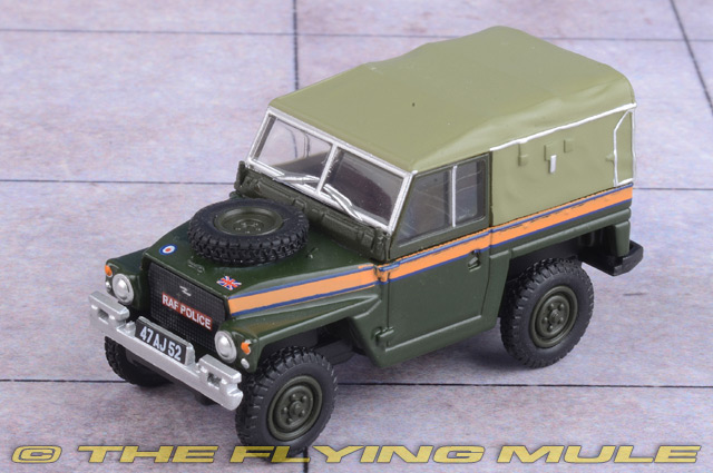 This 1/2 ton Lightweight Land Rover joins the 1:76 scale in its military role. It is decorated as an RAF Police vehicle in dark green with olive green canvas back and chrome bumpers. The distinctive red and blue Police band runs along the waist of the model on each side, while on the front, the RAF POLICE graphics are printed in white out of red across the radiator grille. The bonnet features the Union Flag and the RAF Roundel and the latter is also printed on the rear nearside wing. The military registration plate reads 47 AJ 52.