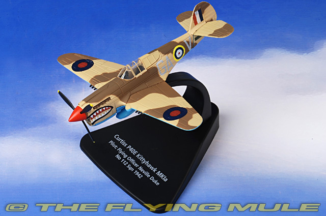 The Curtiss P-40 was an American, single engined, single-seat all metal fighter and ground attack aircraft. Built by the Curtiss-Wright Corporation, Buffalo, the aircraft first flew in October 1938. The Kittihawk was the P-40D variant, following on from the Warhawk and Tomahawk. The Kittihawk was used to best advantage during WWII by the Allied air forces in North Africa, the Southwest Pacific and China. This model, which comes complete with display stand, takes on the desert camouflage as used in the Mediterranean and North African operations, where the aircraft was flown by the prominent WWII flying ace, Neville Duke. Squadron Leader Neville Duke was the top Allied flying ace in the Mediterranean Theathre, where he shot down at least 27 enemy aircraft. After the war, he became known as one of the world's most successful test pilots, flying for the Hawker Company. At one time he held the world air speed record flying a Hawker Hunter F Mk3 at 727.63 mph along the south coast of England. Designed to meet a USAAC requirement for a pursuit aircraft, the P-40 Warhawk was first flown on October 14th, 1938. This aircraft was tough, virtually trouble-free and saw continual improvements to arms, armor and engines. The P-40 served in numerous combat areas; often outclassed by its adversaries in speed, maneuverability and rate of climb, it earned a reputation for extreme ruggedness. Its strong construction, heavy firepower, and ability to dive enabled it to compete with enemy fighters, and it was a formidable ground-attack aircraft. P-40s were also flown by the famed Flying Tigers against the Japanese in China. © Copyright 2003-2025 The Flying Mule, Inc. The Oxford Diecast "Oxford Aviation" range presents affordable, ready made diecast models of military aircraft. Oxford Diecast "Oxford Aviation" diecast airplanes feature: - Diecast metal and plastic construction.