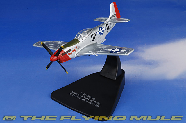 P51D Mustang, as flown by Major Louis 'Red Dog' Norley OC 334th FS, 4th FG, in April 1945 The P-51 Mustang was a long-range single seat WWII fighter aircraft designed and built by North American Aviation. The first production Mustangs were used by the RAF as tactical reconnaissance and fighter bombers. By 1944, the P-51D was a key player in ensuring Allied air superiority over Europe. During its lifetime, over 16,700 were built. Major Louis 'Red Dog' Norley joined the 4th Fighter Group, 336 Fighter Squadron in July 1943. He earned the nickname because of the red Pluto cartoon figure on the side of his usual aircraft, although the cartoon did not appear on the Mustang - merely the 'Red Dog XII' lettering.The Oxford Diecast Mustang carries this lettering. The paint finish is exceptionally detailed too, notably the propellers and front fuselage, exhaust pipes and the anti glare panel. Louis 'red Dog' Norley, one of the notable WWII fighter aces over Europe, ended the war with over 16 kills. He also went to become a Korean War veteran. He died in California in August 1967. Designed to meet an RAF requirement for fighter-bomber and reconnaissance aircraft, the P-51 Mustang was first flown on October 26th, 1940. This versatile aircraft was capable of escorting bombers on long-range missions, engaging in dogfights, and dropping down to destroy German targets on the ground. At least eight versions of the P-51 were produced, but it was the definitive P-51D that gave the Mustang its classic warbird appearance. Britain and the US both tested the airframe with the Rolls-Royce Merlin engine, which gave the aircraft tremendous performance gains. The Truman Senate War Investigating Committee called the Mustang "the most aerodynamically perfect pursuit plane in existence." © Copyright 2003-2025 The Flying Mule, Inc. The Oxford Diecast "Oxford Aviation" range presents affordable, ready made diecast models of military aircraft. Oxford Diecast "Oxford Aviation" diecast airplanes feature: - Diecast metal and plastic construction.