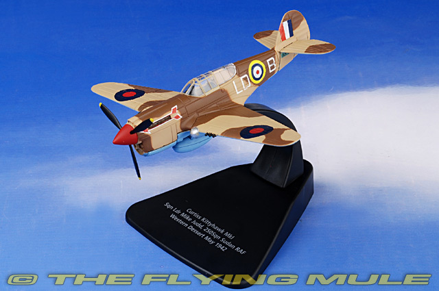 Kittyhawk MkIA as flown by Sqn Ldr Mike Judd, 250 Squadron, RAF in the Western Desert, May 1942. The Kittyhawk was the P-40D version of the US Curtiss P-40 Warhawk, used by the British and Commonwealth air forces during WWII campaigns, particularly in the Middle East and North Africa. The aircraft was produced as a fighter plane between 1939 and 1944 by the Curtiss-Wright Corporation. The Oxford Kittyhawk Mk I is decorated in desert camouflage and represents the aircraft flown by Sqn Ldr Mike Judd, a WWII fighter ace with five victories to his name by the end of the conflict, earning him the DFC, DSO and AFC. He served notably with 238 Sqn. in the Middle East in 1941, flying Hurricanes before taking command of 250 Squadron in April 1942, flying the P-40 Kittyhawk. In May 1942, Mike Judd led an attack on a large formation of Luftwaffe transport aircraft heading for Libya from Crete. He was also escorting a Bristol Beaufighter squadron and between them, they intercepted twelve Junkers 52 troop carriers. He successfully shot down two and his squadron pilots pursued the remainder, with the result that only two Junkers escaped. Our model commemorates this particular episode. Mike Judd died on 22nd August 2010, aged 92. Designed to meet a USAAC requirement for a pursuit aircraft, the P-40 Warhawk was first flown on October 14th, 1938. This aircraft was tough, virtually trouble-free and saw continual improvements to arms, armor and engines. The P-40 served in numerous combat areas; often outclassed by its adversaries in speed, maneuverability and rate of climb, it earned a reputation for extreme ruggedness. Its strong construction, heavy firepower, and ability to dive enabled it to compete with enemy fighters, and it was a formidable ground-attack aircraft. P-40s were also flown by the famed Flying Tigers against the Japanese in China. © Copyright 2003-2025 The Flying Mule, Inc. The Oxford Diecast "Oxford Aviation" range presents affordable, ready made diecast models of military aircraft. Oxford Diecast "Oxford Aviation" diecast airplanes feature: - Diecast metal and plastic construction.