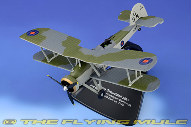 Our 1:72 scale model depicts the Swordfish as it was deployed aboard HMS Furious, a modified Courageous class battlecruiser which was redesigned for essential use as an aircraft carrier. During the early part of World War II, HMS Furious spent her time hunting for German raiders in the North Atlantic until early 1940 when her aircraft provided air support to British troops ashore in addition to attacking German shipping. Our little torpedo bomber was only one of eighteen Swordfish taking part in the Norwegian Campaign in April 1940. Note the camouflaged armament fitted along the length of the lower fuselage. The upper surfaces of Swordfish L2810 are decorated in the sea-going camouflage scheme of dark grey and green with silver grey to the rest of the body and carries the RAF markings on the wings and fuselage. Another detail features the steel catapult hook used for carrier-based take-off and landing, fitted on the underside and painted in silver and black.