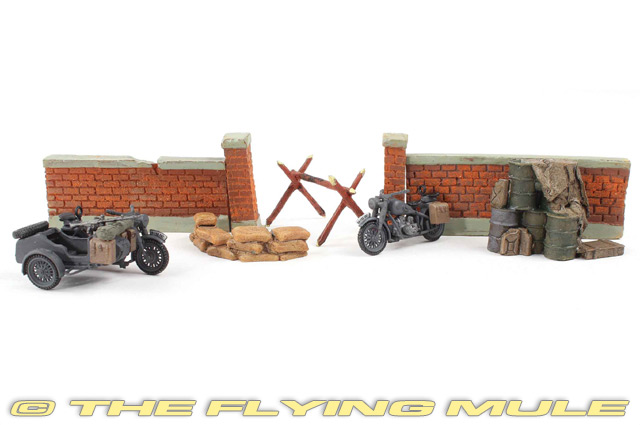 Set ot two hand-painted plastic BMW R75 motorcycles (one with sidecar), two brick wall sections and three other road-block accessories. The perfect addtion to any 1:72 scale, World War II diorama.