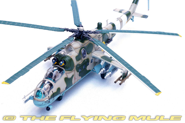 The Ukrainian Air Force has operated the Mil Mi-24P Hind since inheriting them from the Soviet Union in 1991. The "P" model, fitted with a side-mounted twin-barrel 30mm cannon, combines heavy firepower with the ability to transport up to eight troops. Ukrainian Hinds have been modernized with new avionics, communications, and countermeasures to extend their service life. They saw combat in the Donbas conflict beginning in 2014, conducting close air support, strike missions, and supply runs under dangerous conditions. Since 2022, Mi-24Ps have played a vital role against Russian forces, flying low-level, high-risk sorties to support ground operations. Designed as an attack helicopter gunship, the Mi-24 was first flown on September 19th, 1969. It features a distinctive tandem cockpit and is heavily armed with a combination of machine guns, rockets, and missiles, making it effective for both combat and troop transport roles. The Mi-24 can carry eight soldiers in addition to its armament, offering versatility in various military operations. Known for its speed and durability, the Hind has seen extensive use in numerous conflicts worldwide, earning a reputation as a formidable combat helicopter. Its advanced versions continue to serve in many air forces today. © Copyright 2003-2025 The Flying Mule, Inc. The Panzerkampf range presents affordable, ready made diecast models of military aircraft. Panzerkampf diecast airplanes feature: - Diecast metal construction with some plastic components.