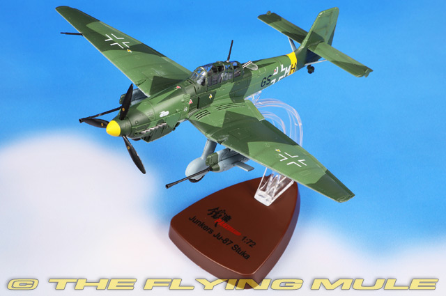On the morning of June 22, 1944 Soviets launched "Operation Bagration" to retake Belorussia and Ukraine. 1.7 million Soviet troops along with 6,000 pieces of armor attacked 34 German divisions with total surprise. By July 17, 1944 Germany had lost 300,000 dead and 120,000 captured and lost more than 2,000 tanks. This meant the loss of German Army Group Center. Still wearing its factory registration, Ju 87G-1 GS+MH from 4. Flieger-Division 10th (Pz) / SG 1 based at Dubno, Ukraine took part in the failed defense. Designed to function as a close support aircraft, the Ju 87 was first flown on September 17th, 1935. The Ju 87 had an innovative design that included automatic dive brakes under each wing-a feature that protected against the consequences of pilot blackout by ensuring recovery from an attack dive. Crewed by a pilot and rear gunner, the Ju 87 had twin 37mm cannons and a bomb that swung away from the propeller on an elongated U-shaped crutch. Its inverted gull wings improved pilot-to-ground visibility, gave the undercarriage a shorter height and made the Ju 87 instantly recognizable to its enemies. © Copyright 2003-2025 The Flying Mule, Inc. The Panzerkampf range presents affordable, ready made diecast models of military aircraft. Panzerkampf diecast airplanes feature: - Diecast metal construction with some plastic components.