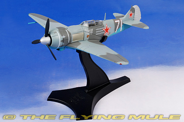SkyMax's 1:72 scale Lavochkin La-5 is a quality, compact model with just the right number of features and a competitive price. This beautiful replica has crisp panel lines and a removable canopy that reveals a pad-printed instrument panel, control stick and aft mounted radio equipment. The radial engine cylinder heads and exhaust heat shielding can be seen inside the cowling, and trim tab details have been incorporated into the simulated fabric-stretched control surfaces. The solid metal wing blends into the fuselage with little or no seam visible, there is an under-wing mounted pitot tube and the aileron hinges and flaps details are cast into the metal.