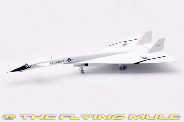 XB-70A #62-0207 or Air Vehicle 2 (AV-2), was the second of two prototype Mach 3 strategic bombers built by North American Aviation. It made its maiden flight on July 17, 1965 and reached Mach 3.08 at 72,000 feet on April 12, 1966. In 1966, AV-2 was turned over to NASA to conduct supersonic transport (SST) research flights, studying aerodynamics, propulsion, and sonic boom effects for future SST development. Sadly, AV-2 was destroyed on June 8, 1966, during a photo flight over the Mojave Desert. The flight included several aircraft, among them a NASA F-104N Starfighter flown by Joe Walker. After the photo pass, the F-104 drifted into the XB-70s wingtip vortex, rolled upward, and struck the bomber. Both vertical stabilizers were lost, and the Valkyrie entered an uncontrollable spin. Pilot Al White ejected and survived, while co pilot Carl Cross and Walker were killed. Designed as an experimental prototype for the B-70 supersonic intercontinental bomber, the XB-70A was first flown on September 21st, 1964.To avoid interception on deep-penetration missions, the aircraft was to be capable of Mach 3+ at an altitude of 70,000 feet. These requirements led to a massive, sleek-looking aircraft powered by six afterburning engines and employing an aerodynamic principle known as compression lift, whereby the aircraft effectively rode upon its own shock wave at supersonic speeds. Additionally, the large wing-tips could be folded down to enhance directional stabilty and compensate for the shifting center of lift at supersonic speeds. © Copyright 2003-2025 The Flying Mule, Inc. The SQ Wings "Aircraft" range presents higly-detailed, ready-made diecast models in 1:200 scale. SQ Wings diecast airplanes feature: - Diecast metal construction, including wings and tail surfaces.