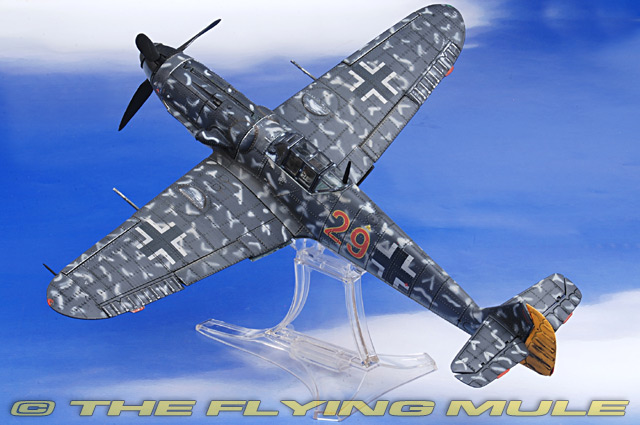 Forces of Valor's 1:32 scale Bf 109G has a high volume of diecast metal components and many working features that are generally only seen on higher priced models. Moving parts include deployable leading edge slats, movable flaps, rudder and elevators, an opening canopy, engine cowlings that hinge correctly at the top and hinged metal main gear for easy display. Inside the radiator flaps are detailed radiators, and the V12 Daimler-Benz DB 605 engine is also finely detailed, as is the hand-painted pilot figure and pad-printed instrument panel inside the cockpit. A 20mm cannon with spent shell casing port is mounted under each wing.