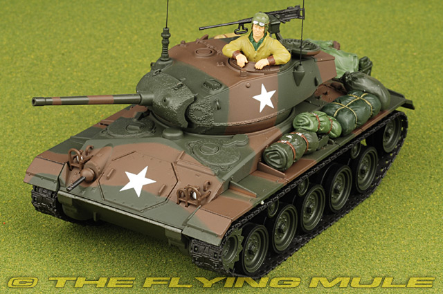 Forces of Valor's 1:32 scale M24 Chaffee Tank is a sporty looking model. The models in this series are constructed almost entirely of plastic, which allows for maximum details welding bead seams and the simulated look of cast metal seen on the guns mantlet. The 360 degree rotating turret features a moveable M2 Browning machine gun, removable crew figure, two metal antennas and pivoting metal cannon. The hull features separately applied battlefield equipment that is molded to contour the hull's surface for a realistic fit. Each release has rolling rubber tracks and wheels, and a nicely detailed metal underside with maintenance access panels.