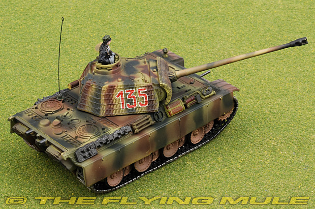 Forces of Valor's 1:72 scale Panther Tank is constructed using an intelligent mix of diecast metal and plastic, with the top portion of the hull in metal, and plastic in those areas requiring greater detail, such as the turret and wheels. This model has many moving parts, such as the machine gun barrel, rolling rubber tracks with interleaved wheels and a 360 degree rotating turret. Other fine details include a maintenance hatch with individually molded bolts, hand-painted equipment and tools, separately-applied spare track, a metal cannon, a hand-painted commander figure, a wire antenna and a simulated Zimmerit coating covering the turret and hull.