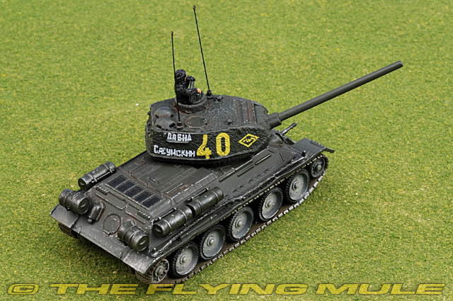 Forces of Valor's 1:72 scale T-34 Tank is constructed from diecast metal, with plastic used only when necessary to achieve the highest detail. The all-metal hull has battle damaged fenders, a rubber machine gun that is resistant to breakage, and correctly-rendered maintenance hatches featuring individual rivets. The turret rotates 360 degrees and has an elevating 85mm metal cannon, two wire antennas and a hand-painted commander figure. The underside features wide rolling rubber tracks and road wheels with prominent bolt heads. There are rolling rubber tracks and road wheels with simulated rubber tread, and the entire model features beautiful weathering effects.