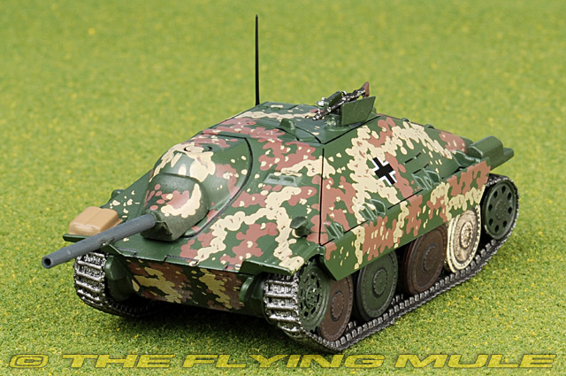 This tank was captured during the withdrawl of German troops from the Polish front. Its camouflage is the very late style that would have been applied to all German tanks had the war continued. Designed as a light tank destroyer based on the Panzer 38(t) chassis, the Jagdpanzer 38(t) Hetzer (or "Baiter") entered production in April 1944. By using a proven chassis, the design was more cost-effective than the Jagdpanther and Jagdtiger designs. In contrast to the earlier Marder and Nashorn tank destroyers, the Hetzer was heavily armored, featuring a 60mm front armor plate, sloped at a 60 degree angle. The orginal Jagdpanzer 38(t) carried a 75mm cannon but later variants used a 150mm howitzer, while others were outfitted with a flamethrower and redesignated Flammpanzer 38. © Copyright 2003-2025 The Flying Mule, Inc. The War Master "Military Machines" range presents affordable, ready made diecast models of military vehicles. War Master "Military Machines" diecast vehicles feature: - Diecast metal and plastic construction.