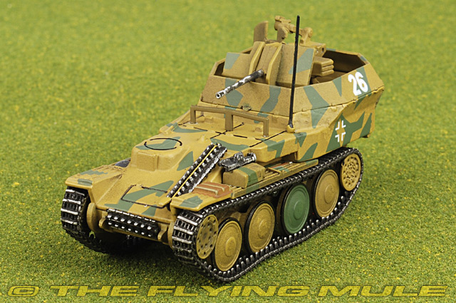 On October 15th of 1943, Adolf Hitler agreed to produce Gepard, an "interim solution" Flakpanzer before the introduction of a real Flakpanzer based on PzKpfw IV’s chassis. It was armed with single 20mm Flak 30 or 20mm Flak 38 L/112.5 gun (with 1040 rounds of ammo) and was build on PzKpfw 38(t) Ausf L/M’s proven chassis. Designed originally for the Czech military, the LT vz 38 was produced as the Panzer 38(t) after the German occupation of Czechoslovakia in 1938. In comparison to Germany's Panzer I and Panzer II tanks at the time, the Panzer 38(t) was well armed and extremely reliable, prompting Germany to produce more than 1400 examples. When it became clear that the design was outclassed by the Soviet T-34, its chassis and drivetrain continued to be developed into the Marder III mobile anti-tank gun and Jagdpanzer 38(t) Hetzer tank destroyer. © Copyright 2003-2025 The Flying Mule, Inc. The War Master "Military Machines" range presents affordable, ready made diecast models of military vehicles. War Master "Military Machines" diecast vehicles feature: - Diecast metal and plastic construction.