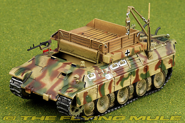 The Sd.Kfz.179 Bergepanther was an armoured recovery vehicle was based on the Panther Tank chassis. Since Panther or Tiger tanks that were too heavy for exisiting recovery vehicles to tow, a heavy duty tank recovery vehicle was needed. Tigers at the time were also much more valued than Panthers considering that they were produced in fewer numbers so naturally the Panther was the chosen base from which to create the new armored recovery vehicle. These vehicles produced by MAN were subsequently shipped off to serve during the Battle of Kursk and in other battles until the end of the war. Around two to four Bergepanthers were allocated to each tank unit making up for a total of around 330 vehicles produced during the war, mainly by the company Demag. Designed to replace to the PzKpfw IV, which had met its match in the new Soviet T-34, the Panzerkampfwagen V "Panther" series of heavy tanks were armed with powerful weapons and equally powerful armor protection. Thought by many to be the best German tank of WWII, the Panther featured a sloped armored turret with a long barrel 75mm main gun and an anti-aircraft 7.92mm machine gun. It was equipped with anti-magnetic paste to combat magnetic mines, and armor skirts offered further protection for the track system and crew. Approximately 5,500 Panthers were built during WWII. © Copyright 2003-2025 The Flying Mule, Inc. The War Master "Military Machines" range presents affordable, ready made diecast models of military vehicles. War Master "Military Machines" diecast vehicles feature: - Diecast metal and plastic construction.