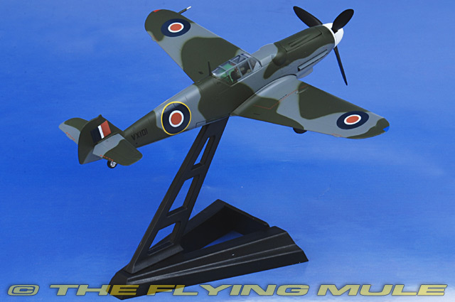 Witty's 1:72 scale Bf 109 is a high-quality reproduction at an affordable price. Some of the details on this beautiful model are so fine they could be overlooked, such as tiny pad printed placards that are only visible upon close inspection (a feature rarely seen in models of this scale). The wing is solid diecast metal, with trim-tab detail and a metal pitot tube. Each release has a display stand bearing details such as the aircraft's name, operator or type. Some releases have the early bird-cage style canopy while later variants feature an upgraded canopy, and some also feature center-mounted drop tanks and wing-mounted cannons.
