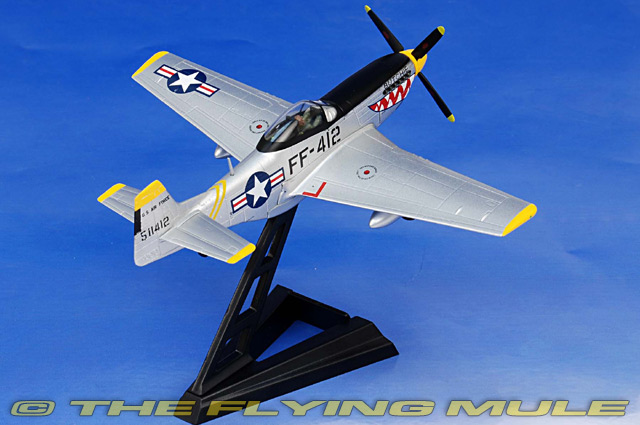 Witty's 1:72 scale P-51 is a beautiful addition to any WWII fighter aircraft collection. The fuselage is constructed almost entirely of diecast metal, and the solid metal wing has subtle panel line details. Fine details also include a correctly-rendered diecast metal exhaust stack, structural detail of the wing that can be seen inside the wheel wells and exceptionally crisp pad-printed placards and unit markings. Included in this series are variants with a variety of wing-mount drop tanks and accurately modeled radiator scoops. Each release also has a display stand bearing details such as the aircraft's name, operator or type.