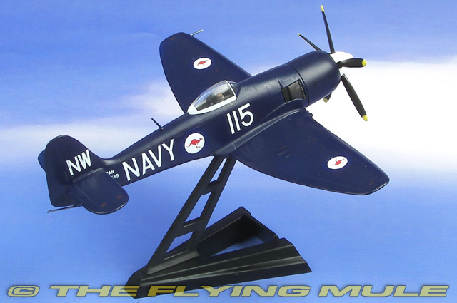 Witty's 1:72 scale Hawker Sea Fury is constructed almost entirely of solid diecast metal. The models in this series feature distinct-yet-subtle panel lines and rivets, an uncommon feature in diecast metal (usually only seen on plastic models). The near solid fuselage has an all-metal empennage, a bubble canopy for easy viewing of the pilot figure and a sleek, five-bladed propeller and hub that blends seamlessly with the engine cowling. The solid metal wing has 20mm cannon ports on the leading edge, sturdy fixed landing gear and a variety of wing mounted drop tanks and ordnance loads. Releases in this series include the single-seat fighter-bomber and two-seat trainer variants.